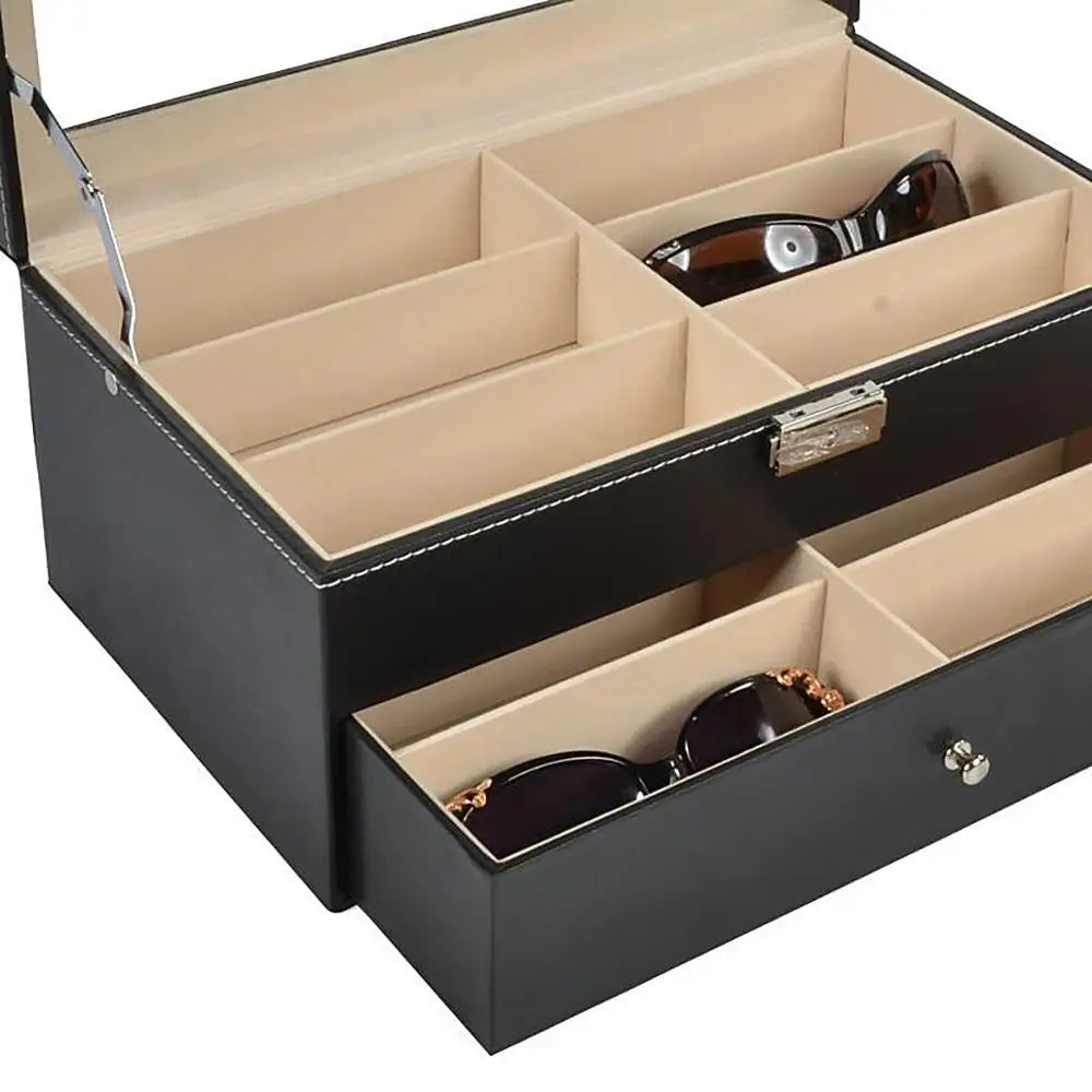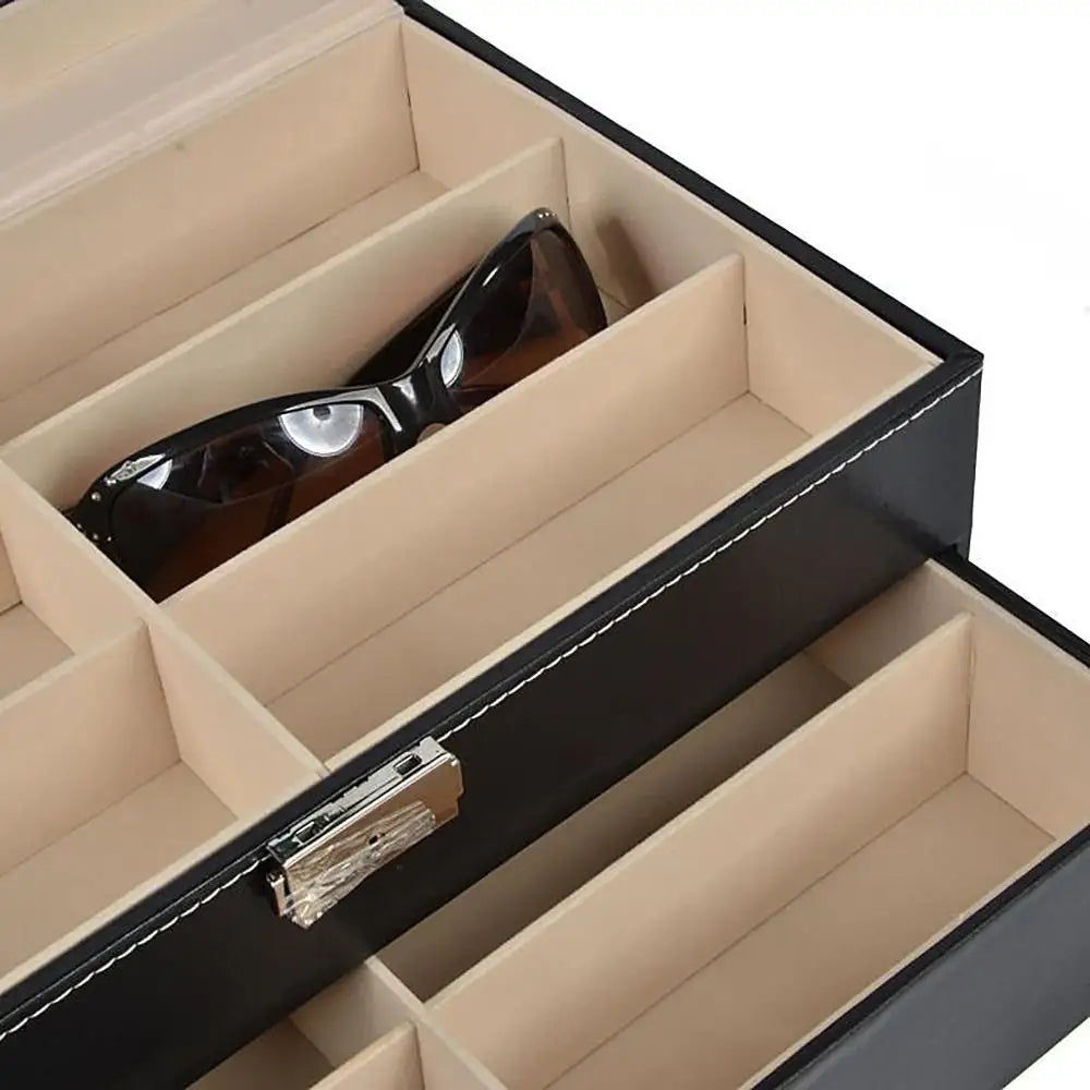 12 Grids Black Sunglass Organizer Leather Eyeglasses Collector Double-Layer Eyewear Display Case Lockable Storage Box