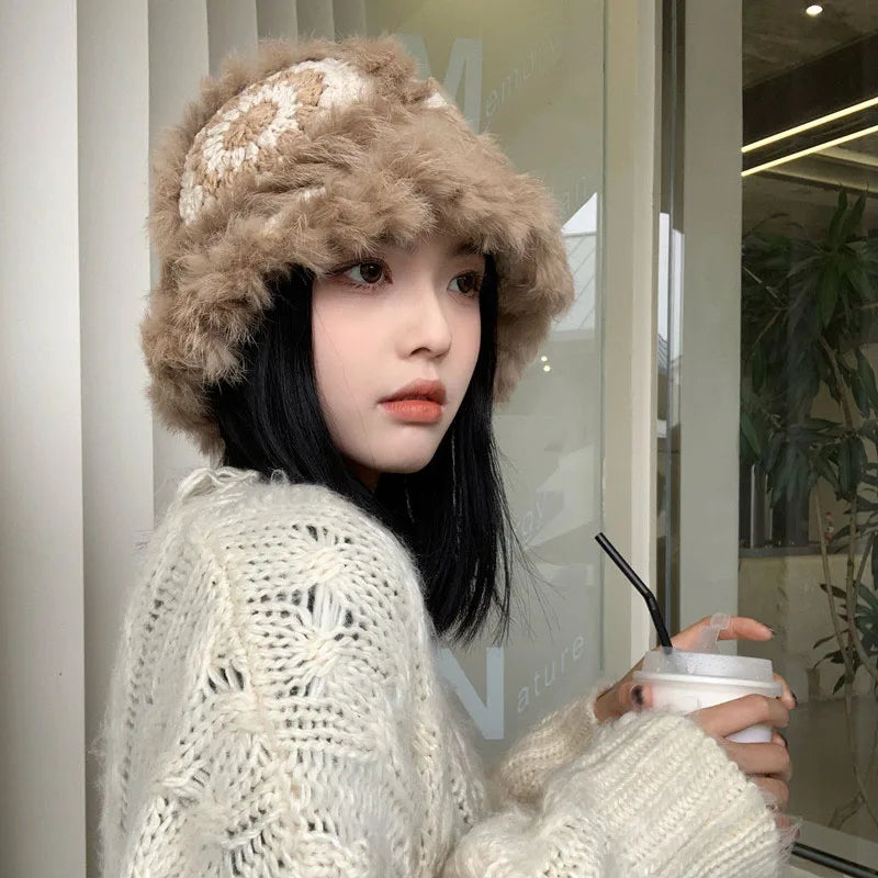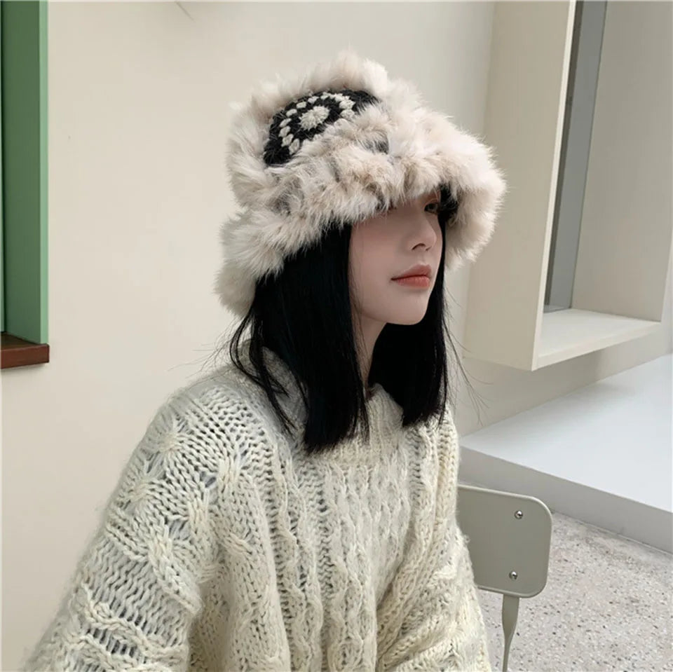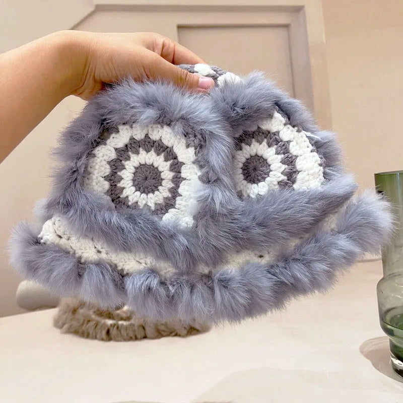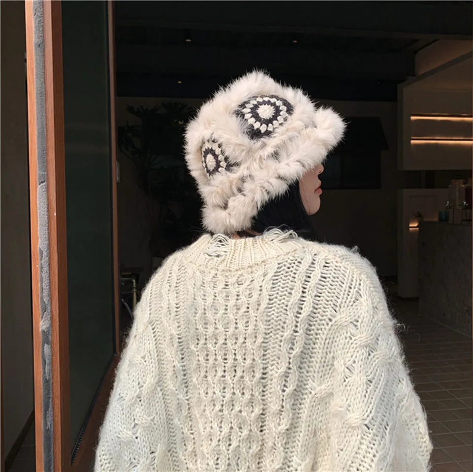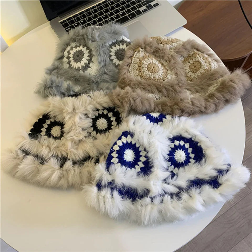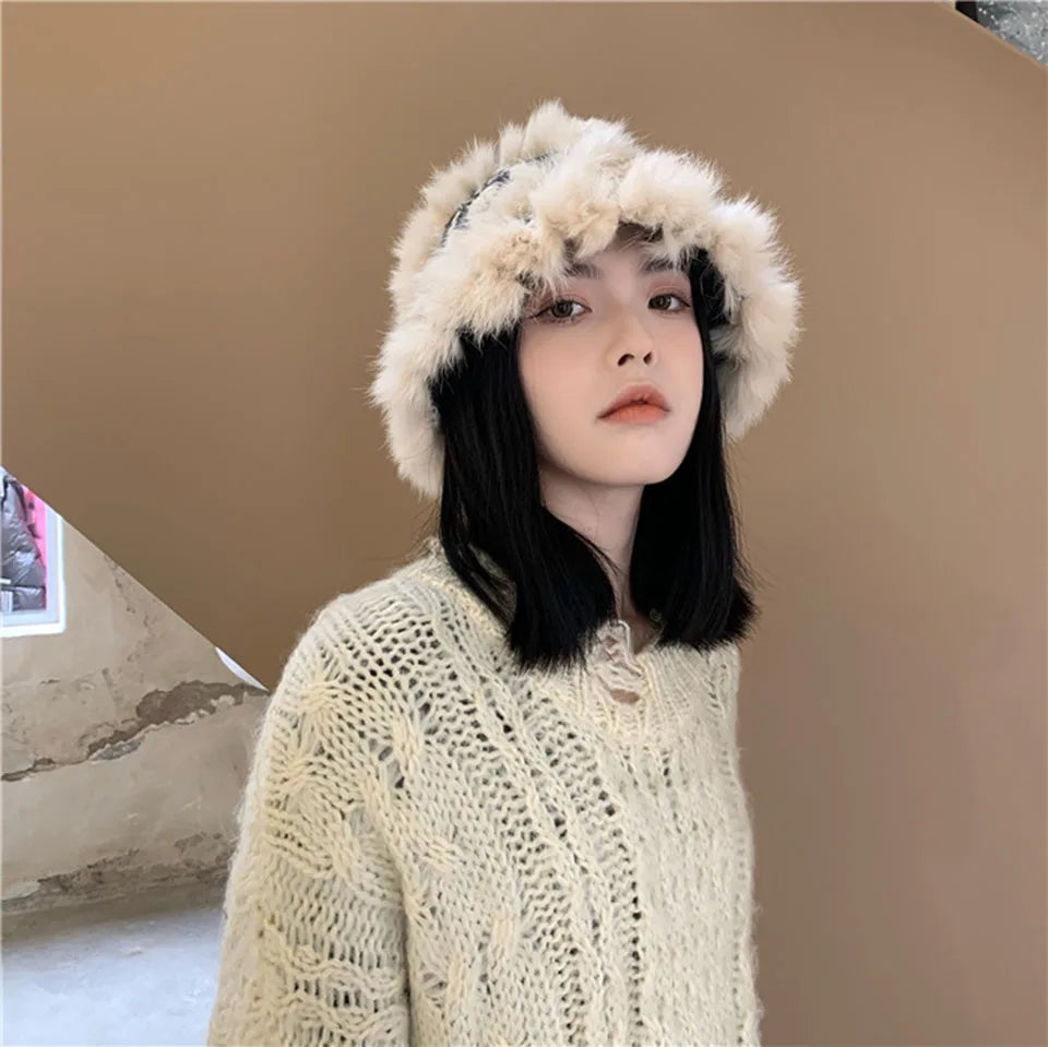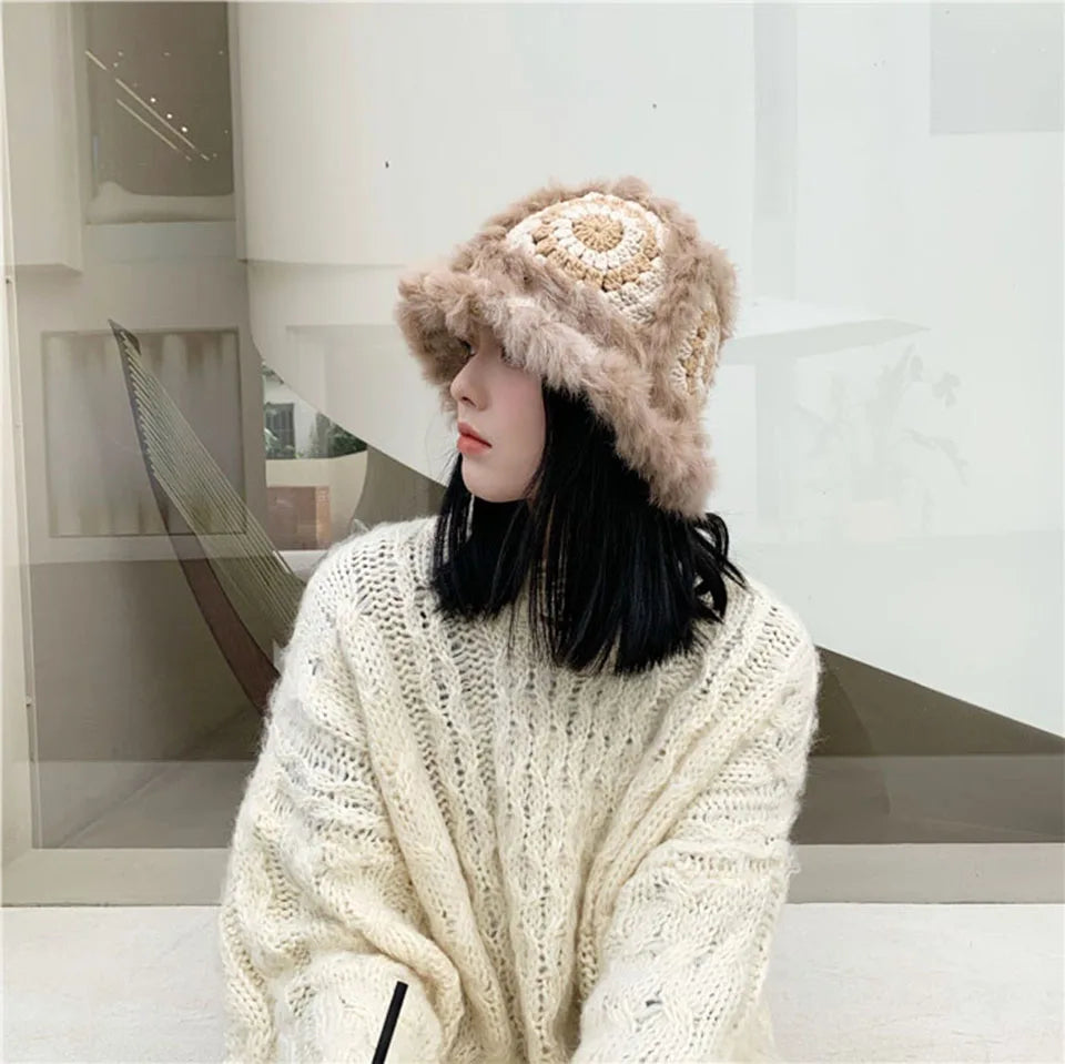 2021 Handmade hook flower 100% Natural Fur Hats Knitted Warm Genuine Mink Fur Cap Russian Women Luxury Panama Fur Hat wool kpop