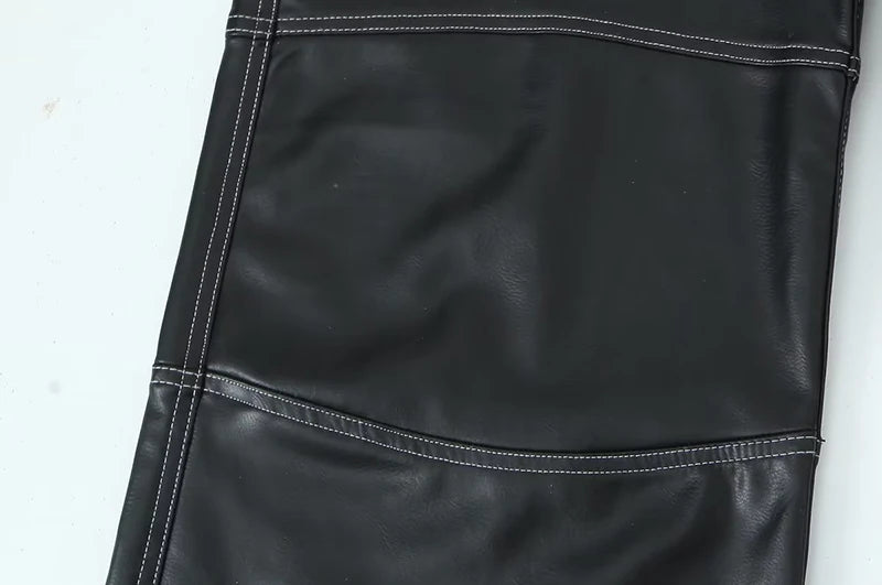 2023 Women's Autumn Black Faux Leather Wide Leg Fleece Pants Vintage Winter High Waist Office Lady PU Female Trousers Mujer