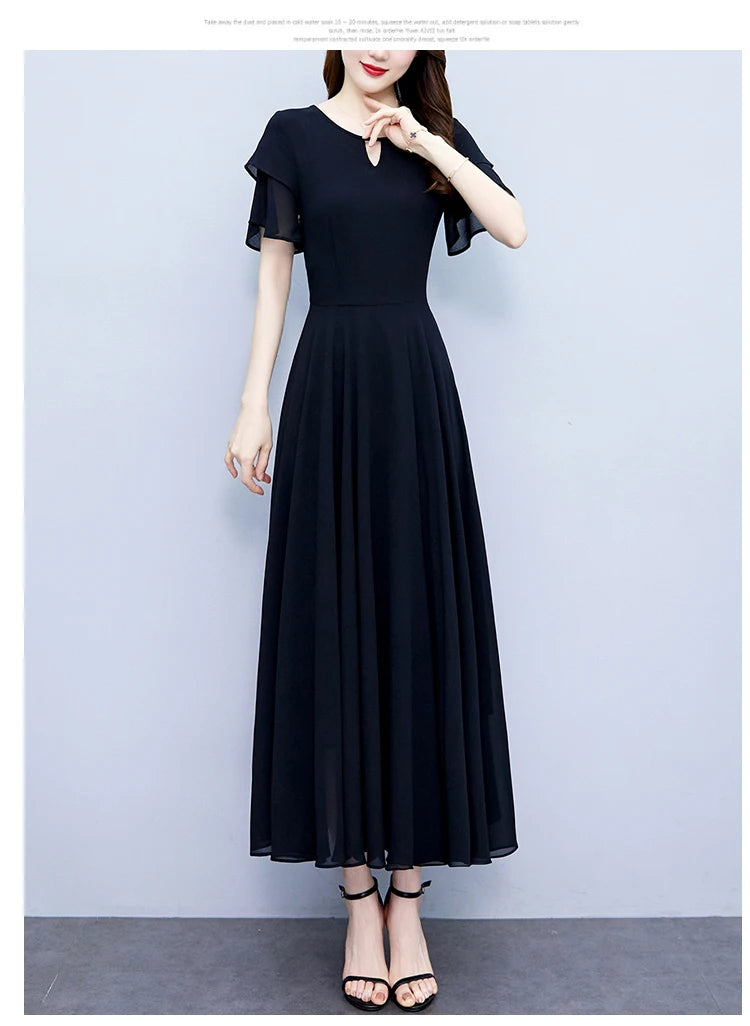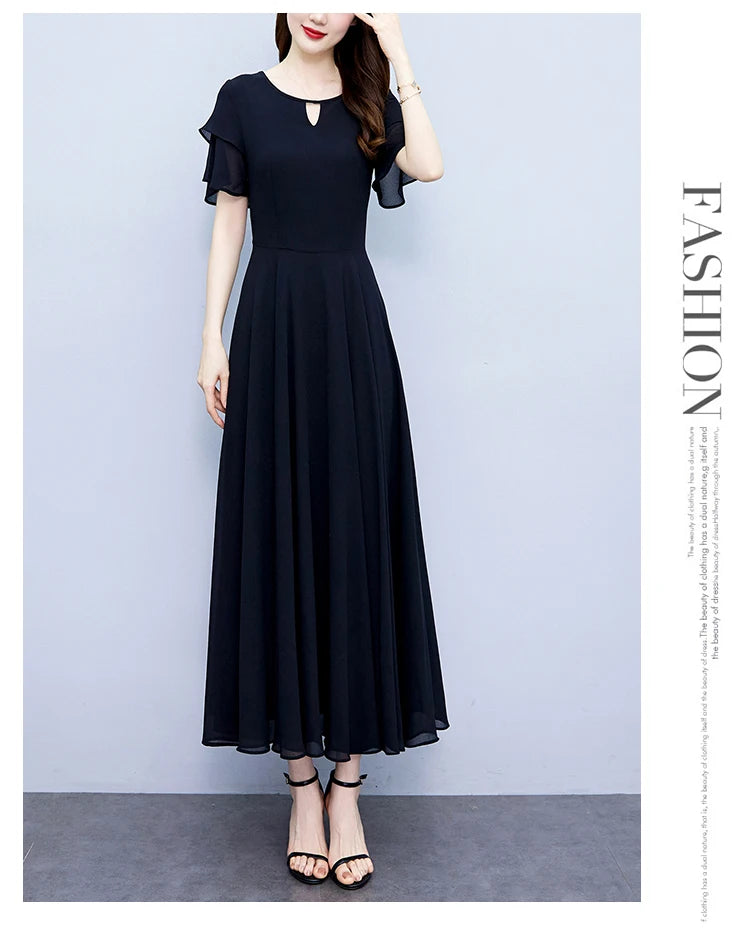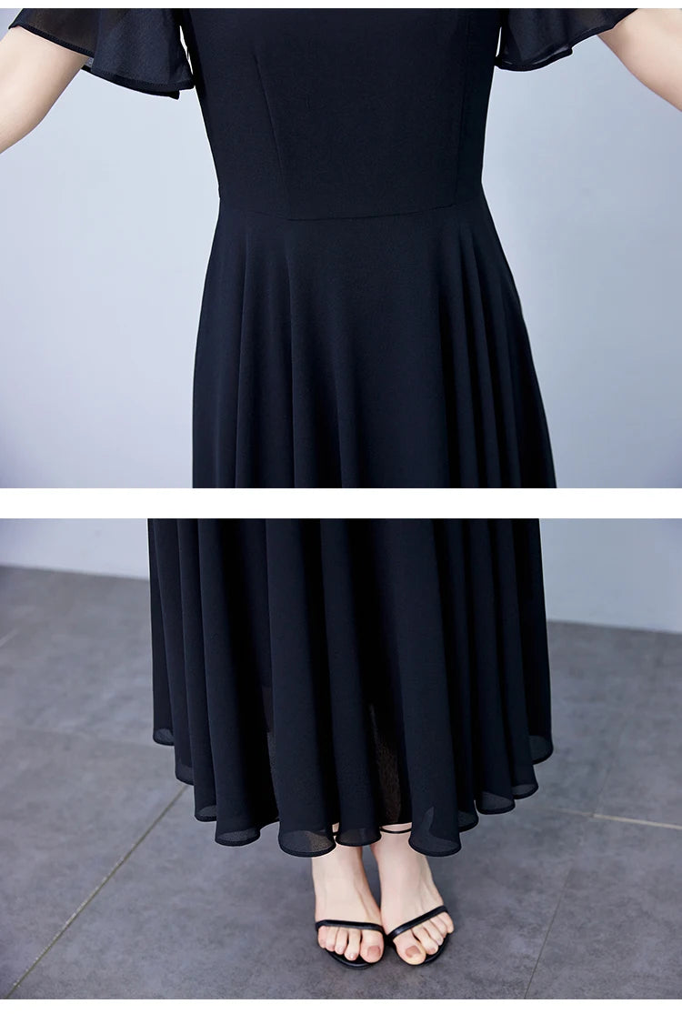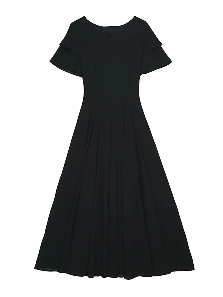 2024 Black Chic Ruffled Short Sleeve Midi Vestidos Women Vintage Hepburn Prom Long Robe Summer Solid Elegant Bodycon Party Dress