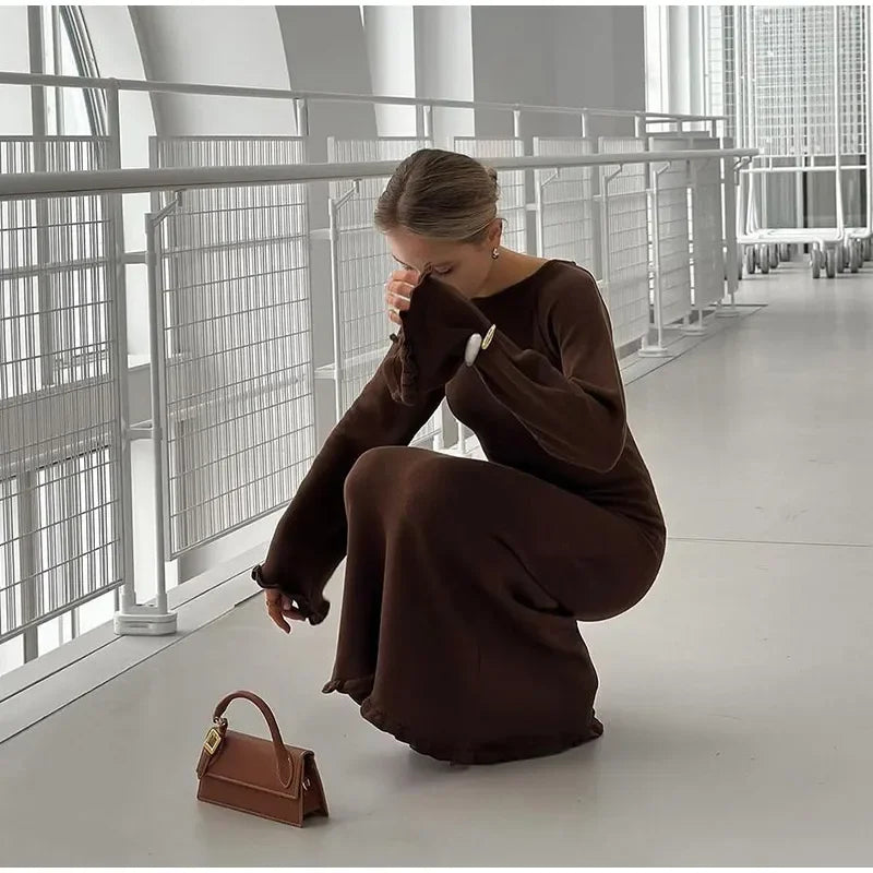 Elegant Roll Edge Party Dress For Women Long Sleeve O Neck Slim Flare Sleeve Long Robes 2025 New Lady High Street Evening Gown