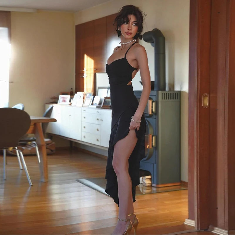 Hugcitar Square Collar Slips Backless Draped Lace Up Pleated Irregular Sexy Midi Dress 2024 Spring New Outfits Festival Party