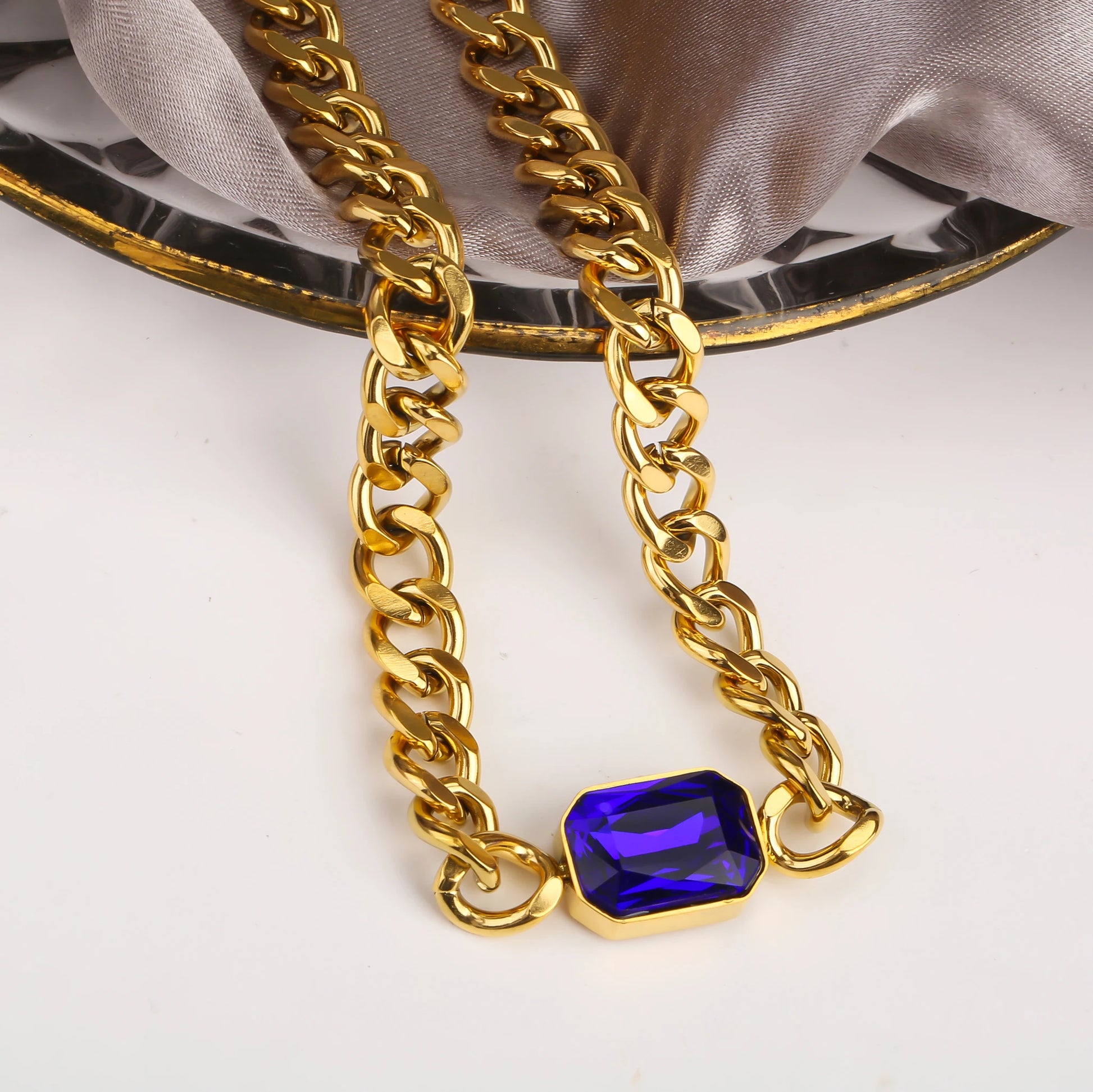 Personalized Rectangle Colorful Crystal Six-Sided Polished Cuban Chain Necklace Bracelet Set For Woman Stainless Steel Jewelry