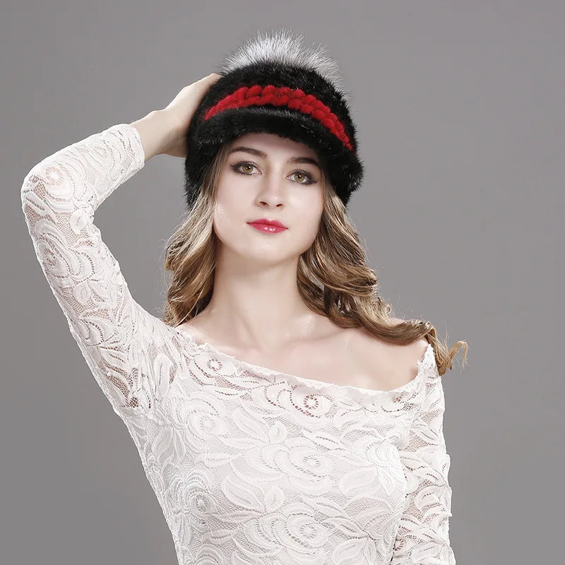 Winter New Mink Fur Knitted Visor Hat Women Fashion Fox Fur Ball Pompom Cap Female Thickened Warm Outdoor Casual Lady Caps H7058