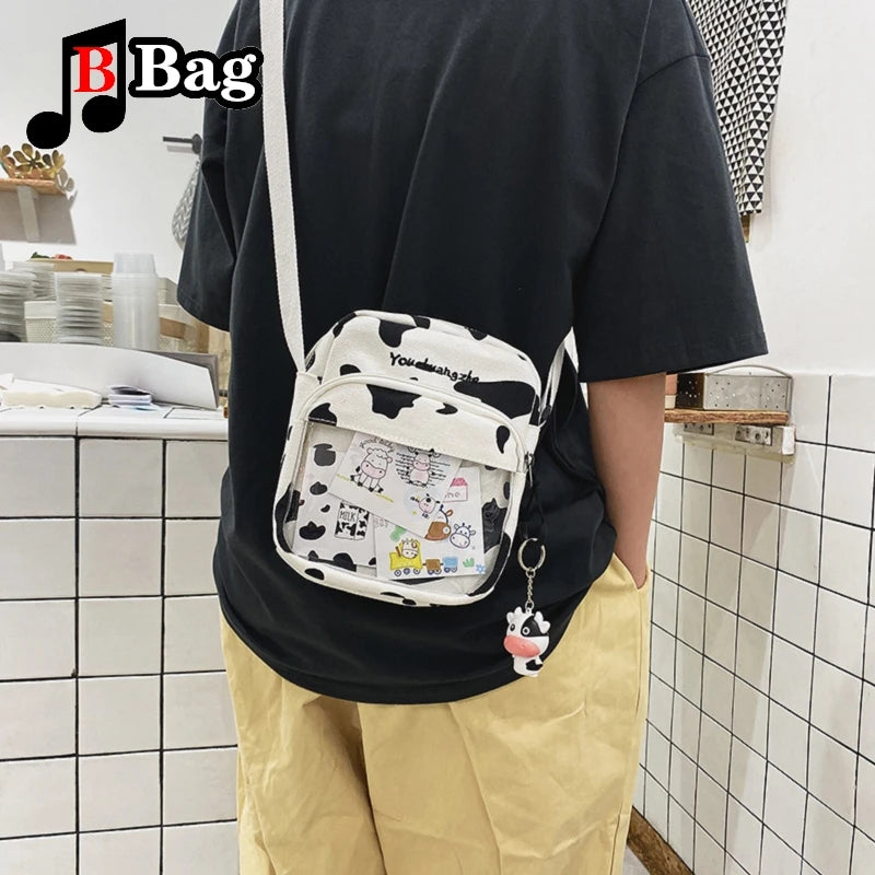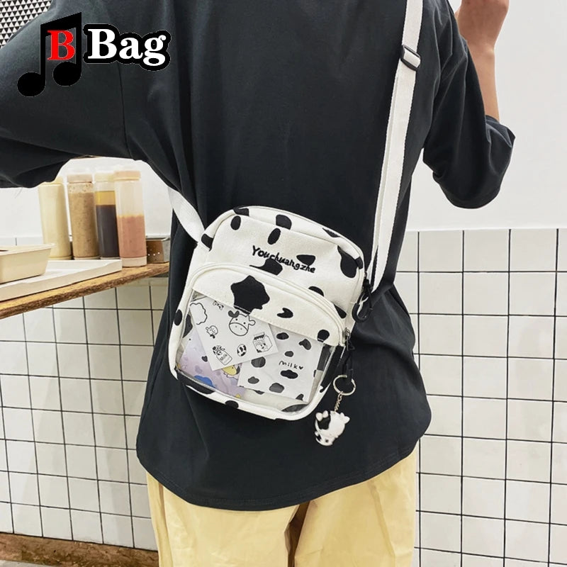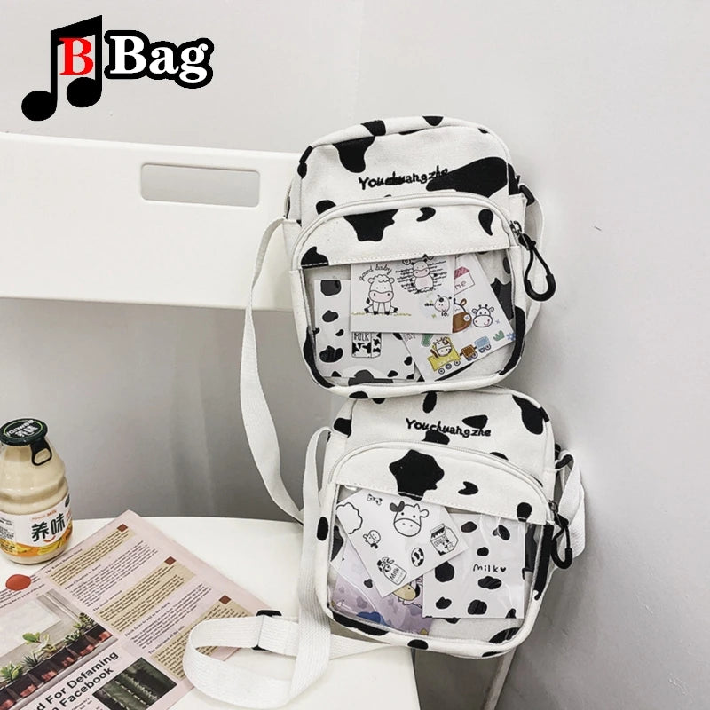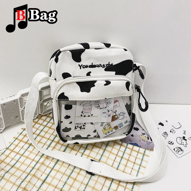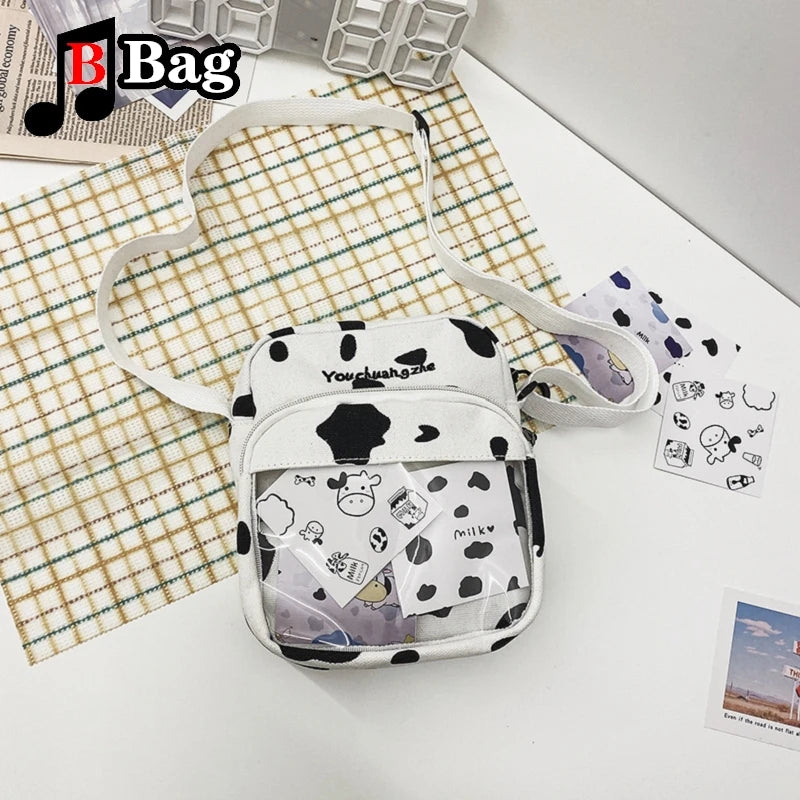 Women Girls Cartoon Cow Print Shoulder Crossbody Bag Cute cow card transparent canvas Satchel itabag