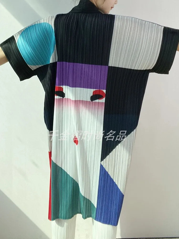 Women Printed Trench Miyake Pleated Fashion Printed Loose Plus Size Japan Style Belt Female Long Coats Tide